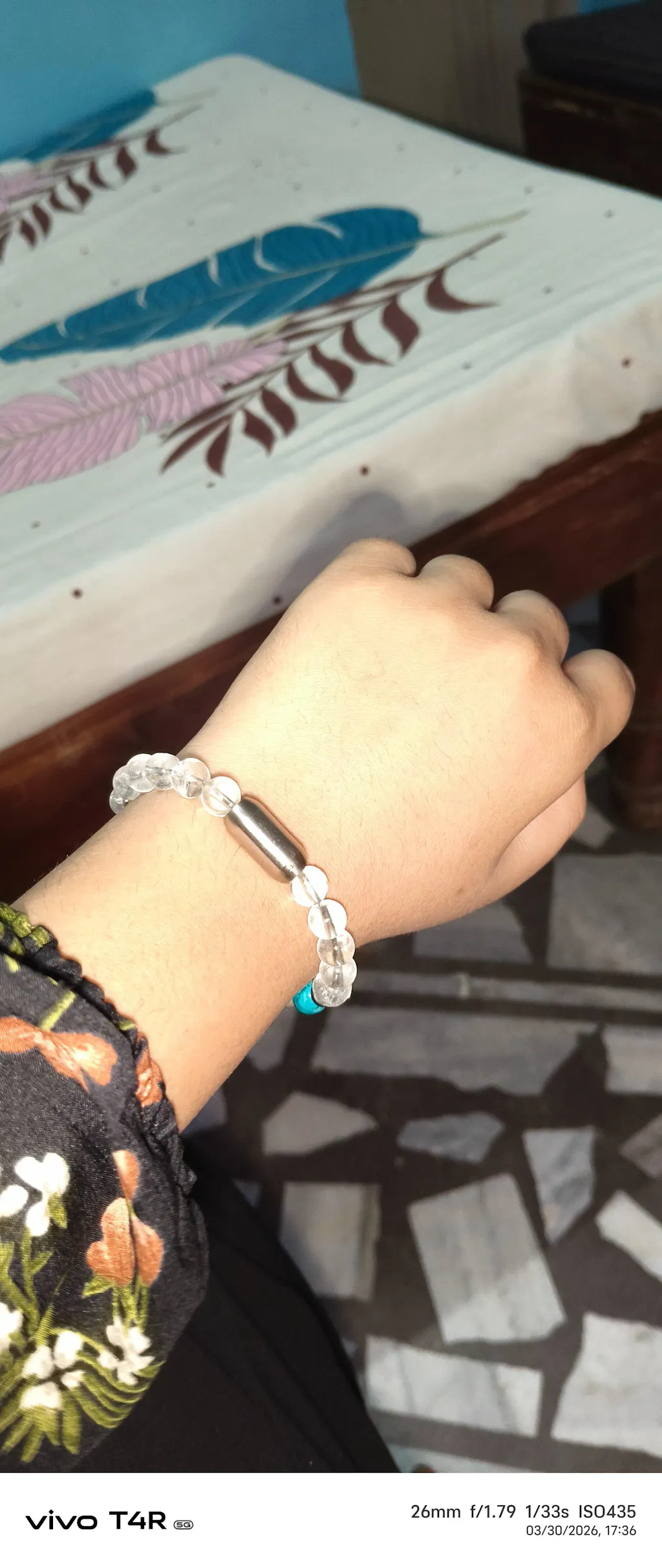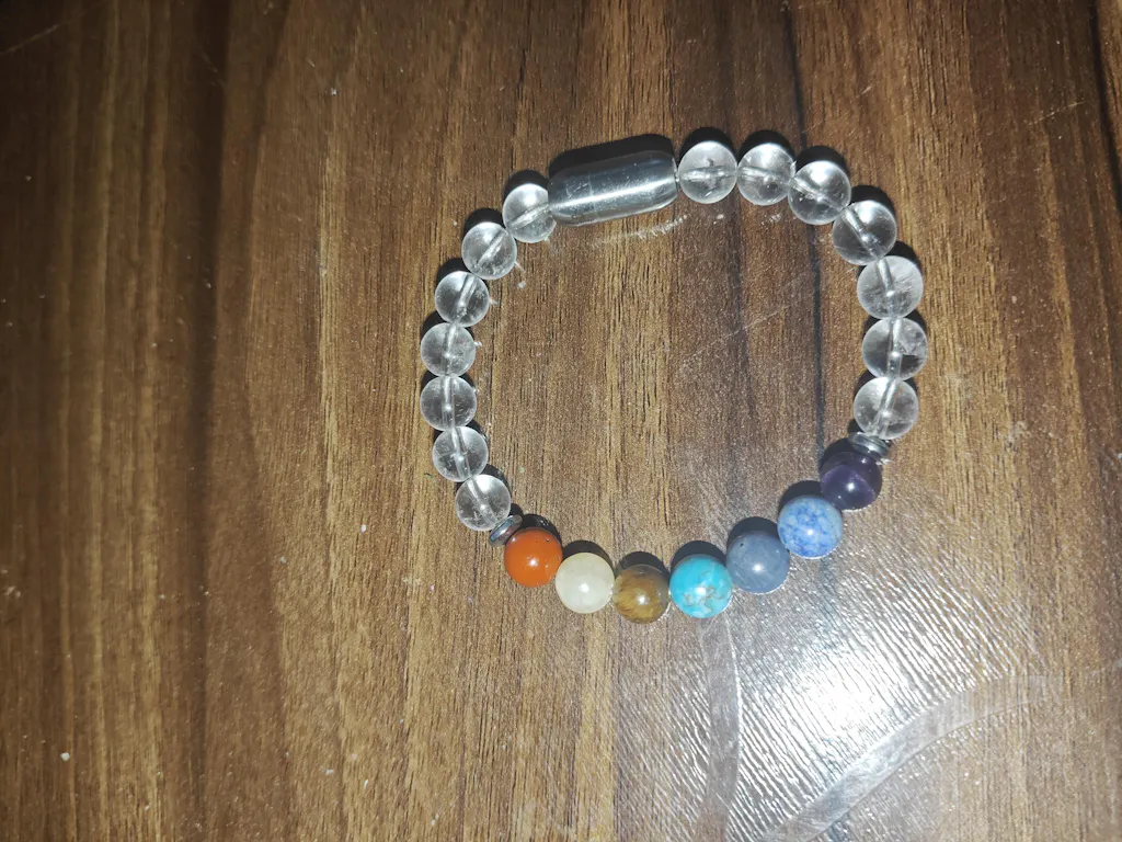 - Made of Clear Quartz (also known as Sphatik), known for its amplifying, balancing, and clarifying properties, along with traditional 9 chakra beads. Each of these beads is believed to have its own unique healing properties.